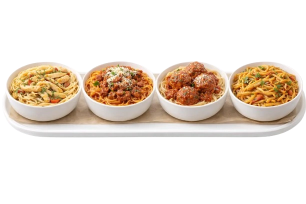 A selection of classic spaghetti and stir-fried noodles featuring vibrant sauces and balanced seasoning for both Asian and Italian lovers.