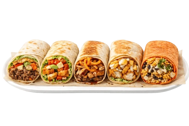 Soft tortilla wraps filled with premium proteins, sauces, and vegetables, offering a convenient yet flavorful meal on the go.